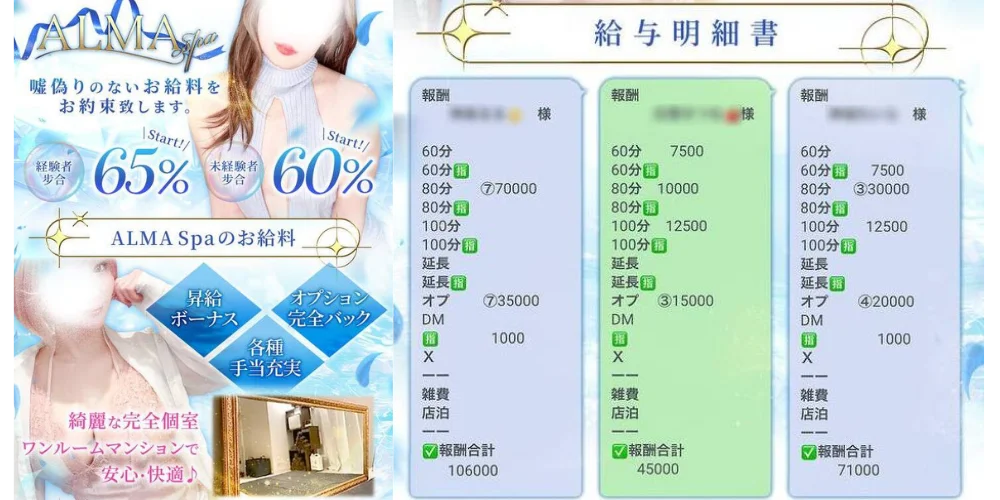 - 当店ではセラピストさんの報酬が多くなるようバックの設定をさせて頂いております。 未経験でも60%のバック率となっており、頑張る方にはたくさん稼いで頂けるような環境をご用意しております。
